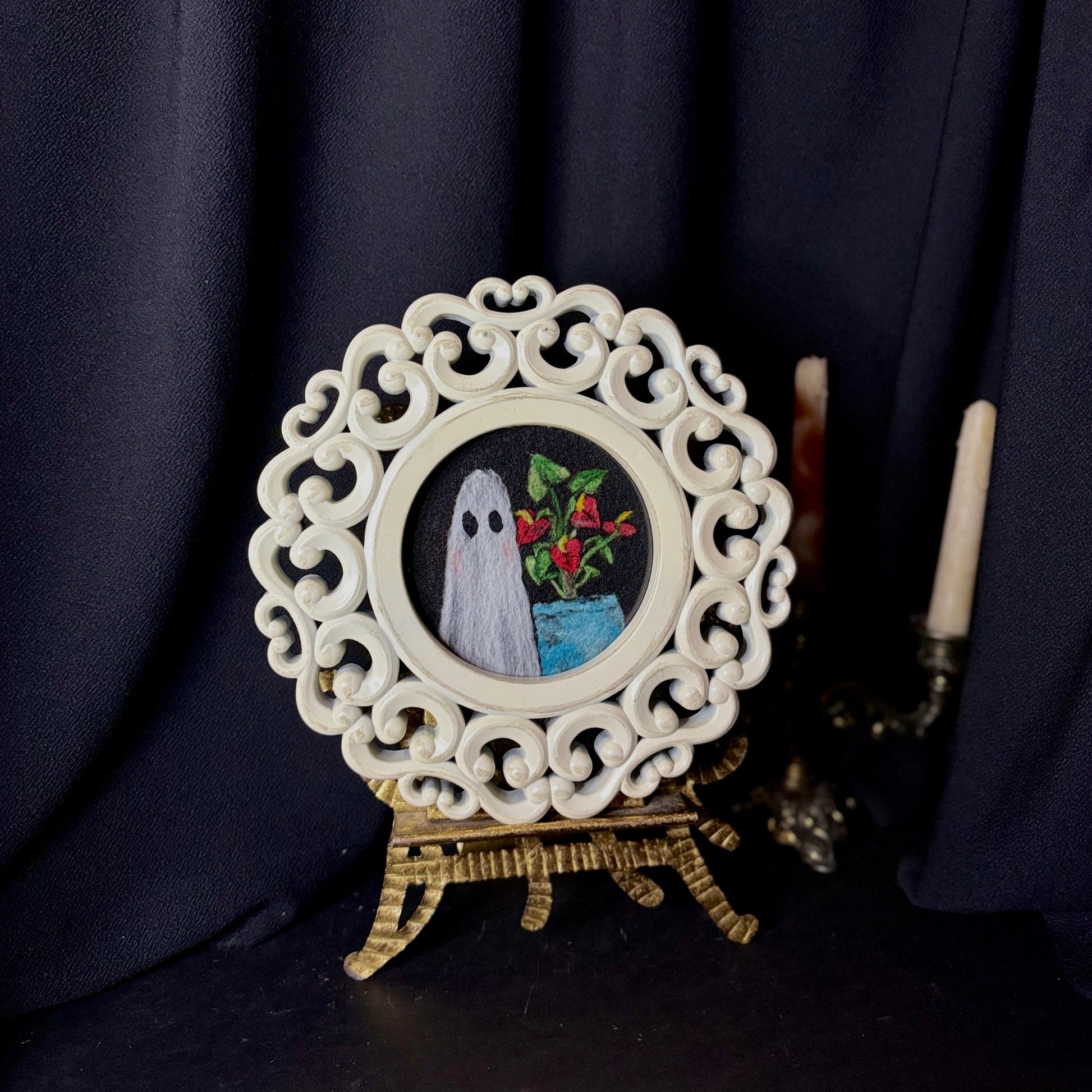 Add a unique touch to your space with this hand needle-felted wool ghost, beautifully paired with a vibrant anthurium plant. Together, they create an eye-catching blend of whimsy and natural elegance that transforms any room.