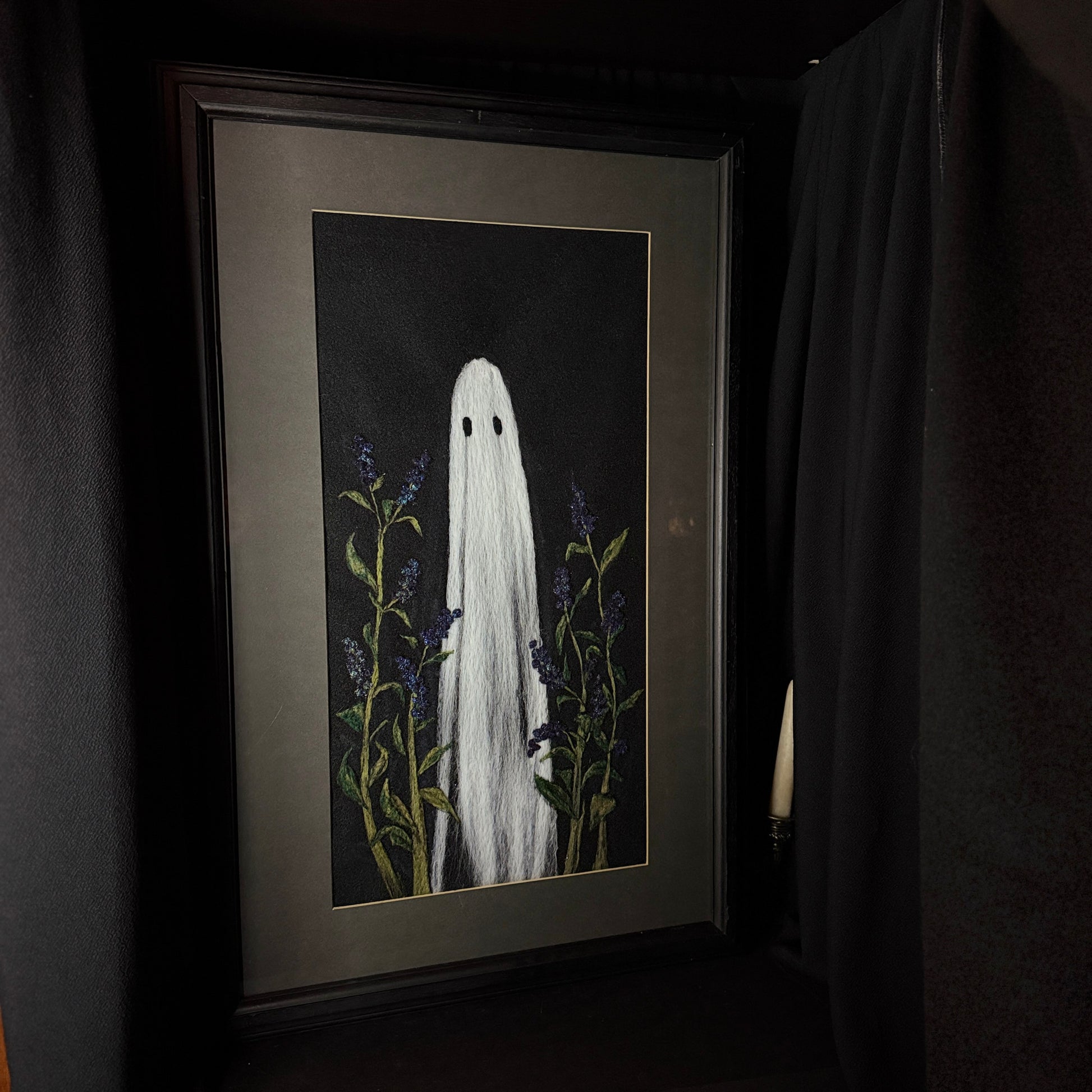 Hand-needle felted from premium wool, this ethereal ghost figure emerges from a dreamlike landscape of deep purple salvia blooms. Delicate angelina fibers woven throughout catch the light with subtle iridescence, creating an enchanting interplay of shadow and shimmer. A sophisticated piece that captures the mysterious beauty of twilight gardens