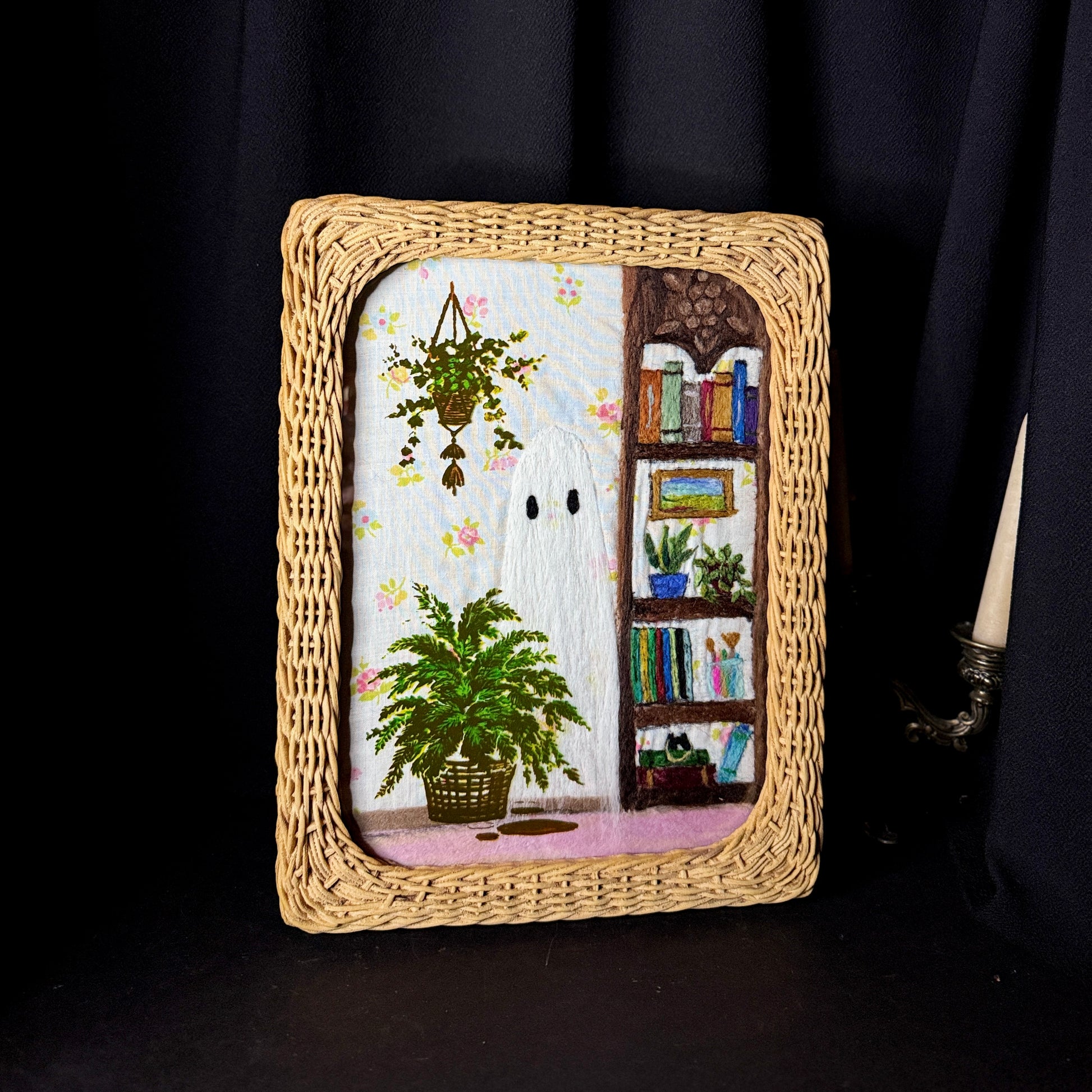 Elevate your home decor with "Favorite Things." A unique piece that combines a wool ghost hand needle felted onto a vintage sheet, a bookshelf of carefully curated items, and hand-painted plants on the glass of a vintage frame. Add a touch of sophistication and exclusivity to your space.