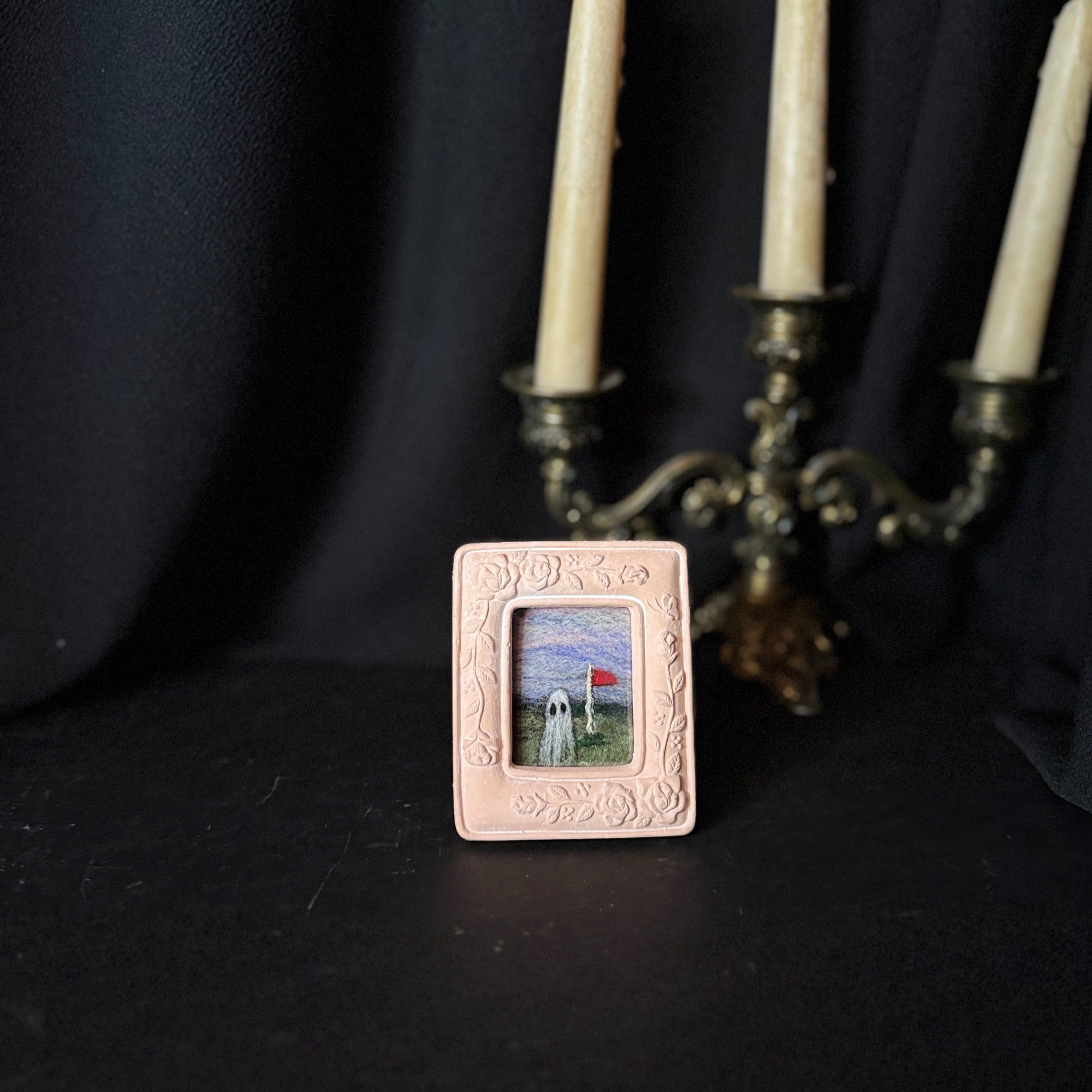 Celebrate your love for golf with "Hole In One," a mini hand needle-felted wool ghost set on a detailed golf green.