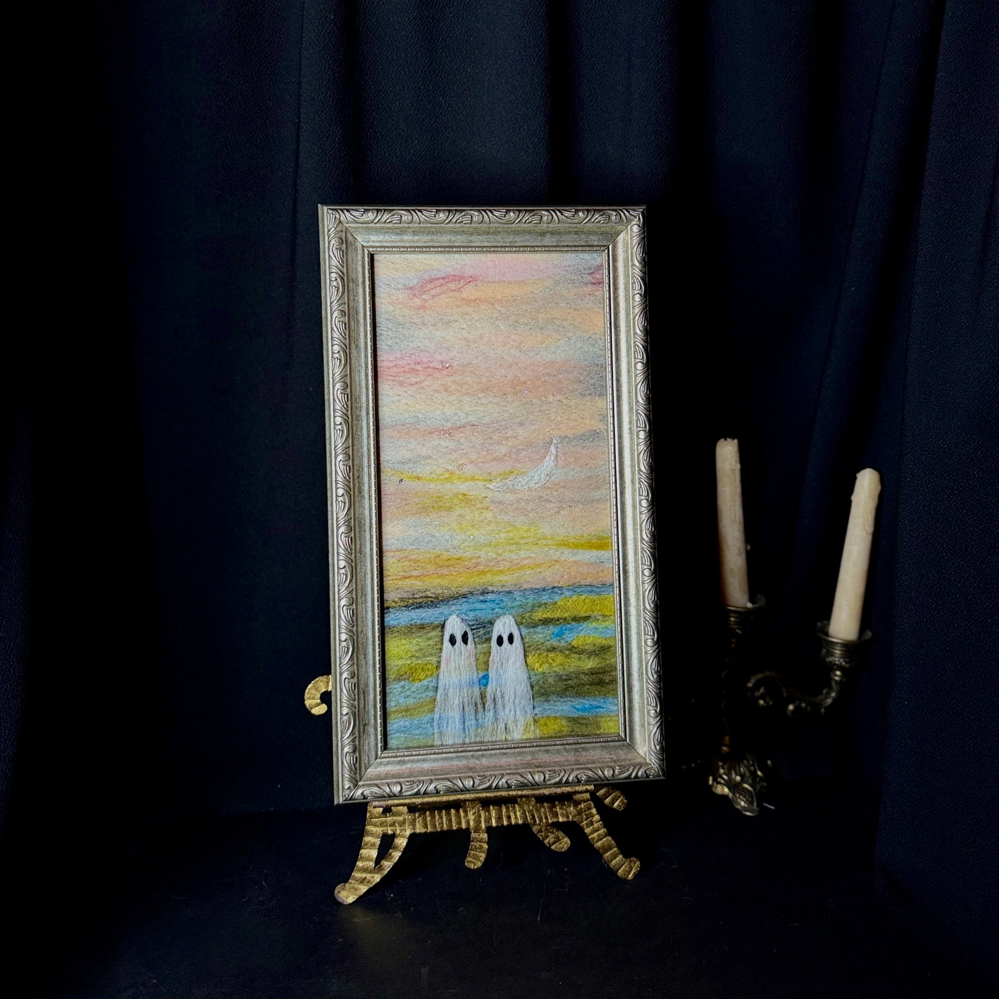 Delight in the charm of hand needle felted wool ghosts set against a serene inner coastal waterway. As a shimmering crescent moon rises, this unique piece brings a touch of magic and tranquility to your space, perfect for adding subtle, haunting beauty to your décor.