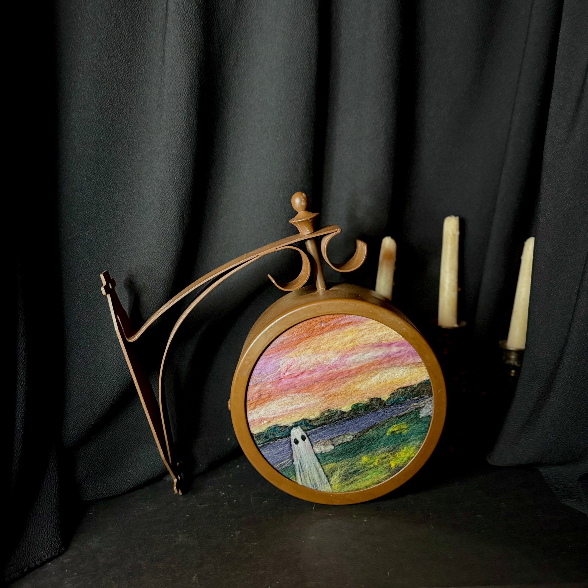Experience the calming presence of Passing Time's hand needle felted wool ghost on the serene lake, beautifully depicted on both sides of this unique clock piece. Add a touch of serenity and whimsy to your home decor with this one-of-a-kind timepiece.