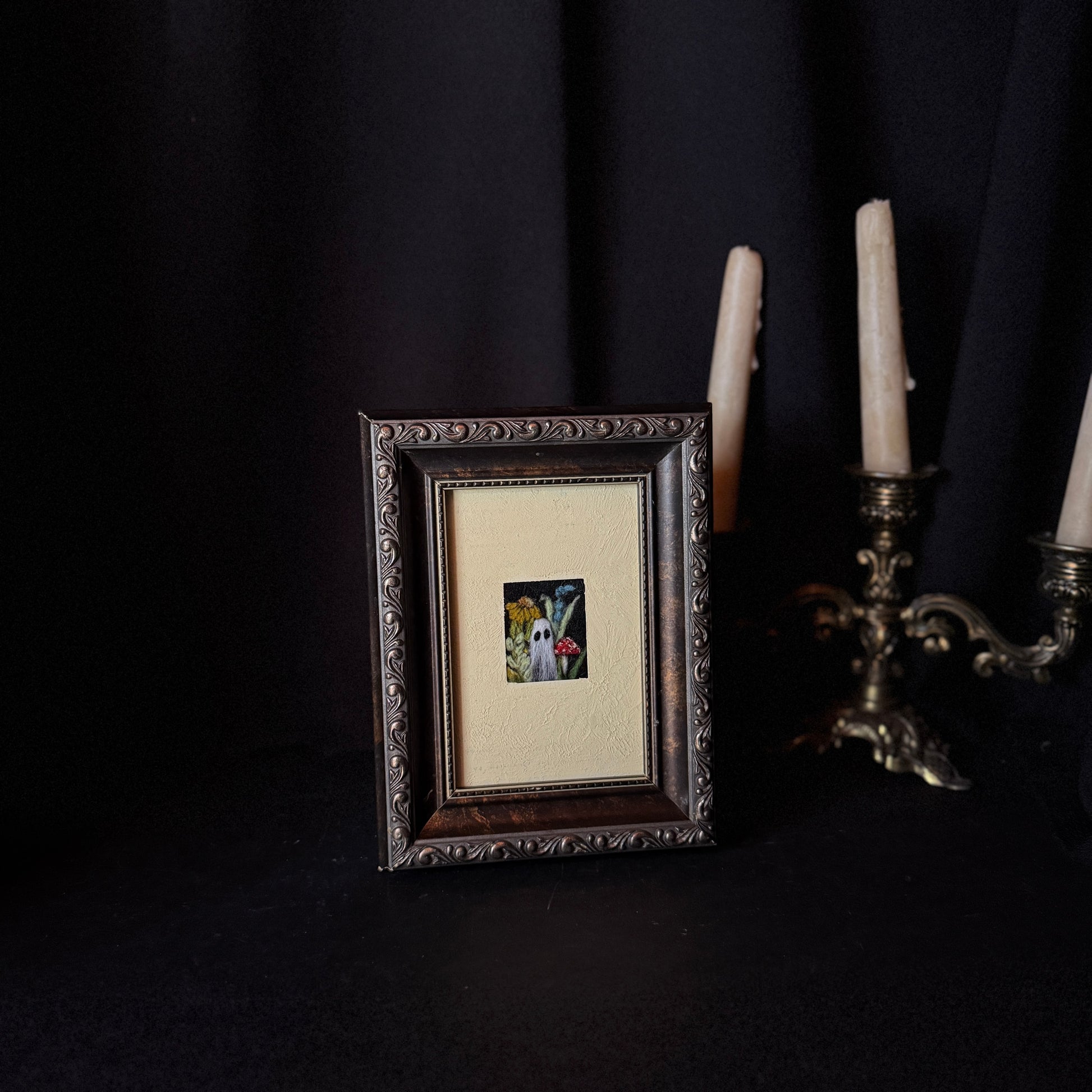 Intricately crafted with a needle-felted technique, our Small Ghost figurine elegantly rises from a bouquet of vibrant flowers. This delicate piece adds a whimsical touch to any decor.