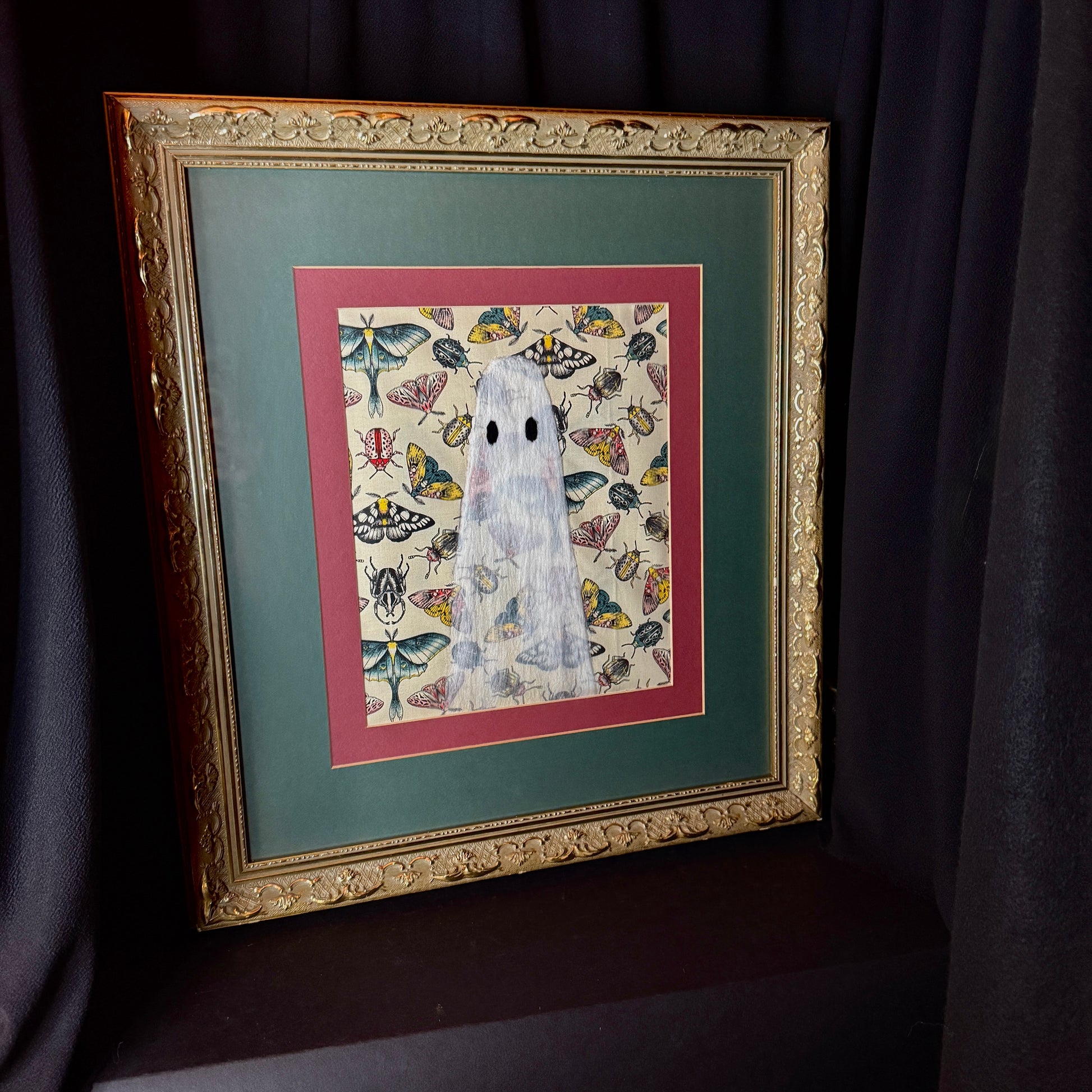 Introducing "With the Bugs" - a hand needle felted sheer wool ghost delicately crafted on a stunning bug background. This ethereal piece adds an elegant touch to any space, while reminding you to embrace the beauty in life's imperfections.
